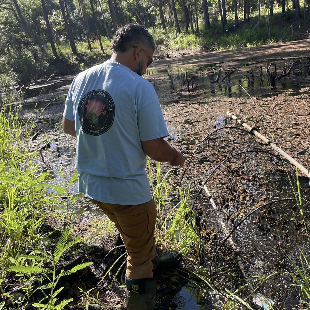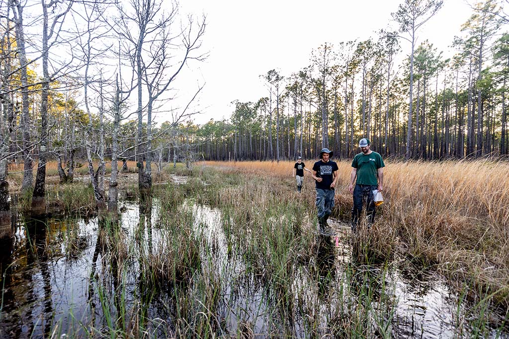 The Francis Marion PARCA, South Carolina, is just one place we’re applying the 3Rs framework on the ground. Here, our team wades into wetlands to survey for spotted turtles. Hoop nets are set in the shallows and baited with lures like wet cat food. The turtles swim through funnel-shaped openings but can’t escape.