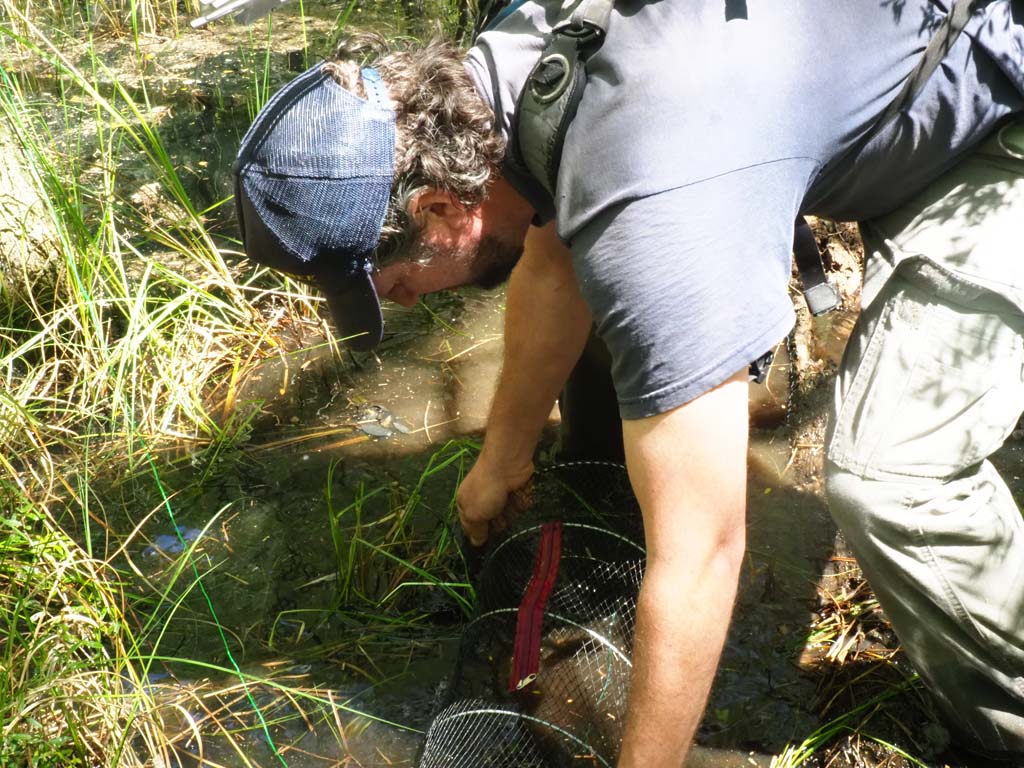 When one is caught, its dark shell flecked with yellow and orange markings is carefully examined. Each turtle is measured, marked, and sometimes fitted with a radio transmitter before being released back into the wetland.