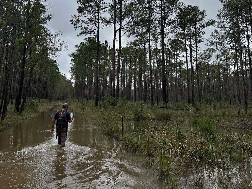But the opposite was true in Georgia. In late 2024, Tropical Storm Debby and an unnamed second storm flooded important sites in the Fort Stewart PARCA here, at just the wrong time. “The nesting habitat that had been used the year before was underwater when we hoped it would be accessible for the salamanders,” said Rob Tiffin, Project Coordinator.