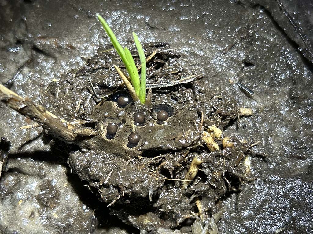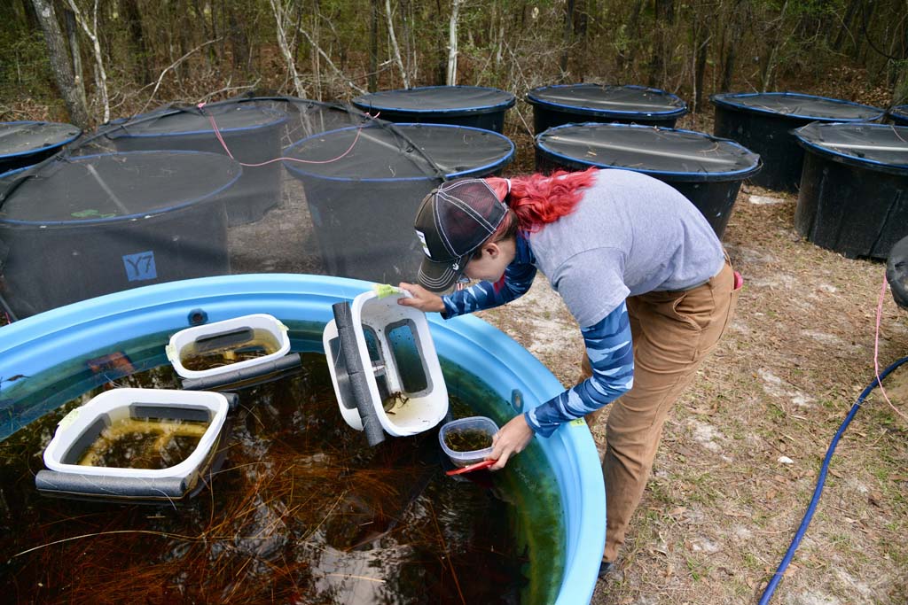 The eggs, along with the tiny clump of soil on which they were laid, are carefully scooped out of the ground and placed into a box with damp soil. Then, once the embryos become more developed, we place them in floating shallow nursery boxes where they hatch, and we track the larvae’s eating and growth. They’re then put into larger mesocosms (outdoor tanks) to grow bigger and more resilient. Finally, when they’re in the latest part of their larval stage, we release them into restored wetlands.