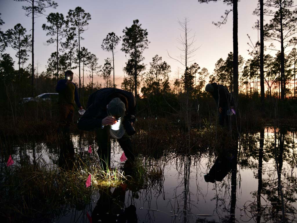 This makes private lands key to the protection of vulnerable species here. We partner with landowners to restore habitat and conduct surveys, systematically monitoring priority species including striped newts, ornate chorus frogs, gopher frogs, and frosted flatwoods salamanders.